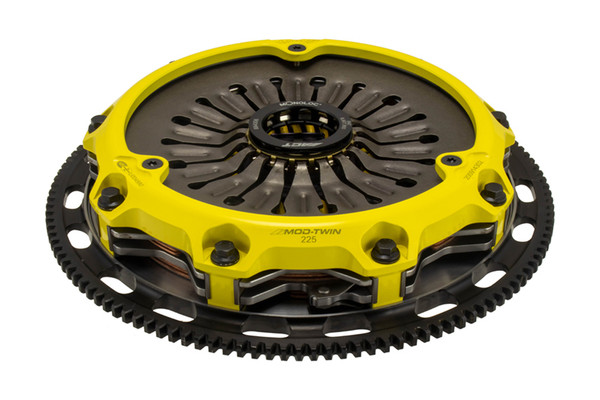 T1R-S07 Mod-Twin 225 HD Rigid Race Kit tackles aggressive launches and rapid shifting of high powered AWD’s by combining twice the ceramic friction surfaces with a no-nonsense solid Mono-Drive hub in a completely modular design. Each diaphragm spring endures an exclusive four-stage heat treating process providing a consistent light pedal feel. Puck-style Friction Plates with high quality ceramic friction materials deliver high friction coefficient, superior heat capacity, and long clutch life. These Friction Plates uniformly transfer torque to a Mono-Drive chrome-moly hub which is heat treated for strength and durability extending input shaft life with one continuous spline. The lightweight, rigid design allows for quicker shifts and trouble-free service. This kit includes a CNC-machined and dynamically balanced flywheel, pressure plate cover, diaphragm spring, face, puck-style ceramic friction plates, rigid Mono-Drive hub, floater, patented Monoloc Collar, release bearing, alignment tool and pilot bearing (if needed). Mod-Twin clutches are fully rebuildable and most components can be ordered separately.