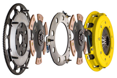 T3R-G01 race, twin disc kit offers twice the number of disc surfaces for better wear, heat capacity and long life compared to single disc kits. These kits use a proprietary Positive Lift Floater System design, which results in quiet operation with no floater rattle and no posts to wear. ACT twin disc kits undergo an exclusive four-stage, heat-treating process on all diaphragms. The ACT twin disc features the ability to adjust for disc wear and provides equal disengagement for discs. ACT's 6-pad rigid race discs are made with high quality, ceramic friction materials. The chrome-moly hub is heat-treated for strength and durability. The lightweight, rigid design allows for quicker shifts and trouble-free service. All ACT twin disc kits include a CNC-machined and dynamically balanced flywheel to ensure trouble-free installation and operation. ACT twin disc kits include a pressure plate, two discs, a floater, flywheel and alignment tool. Some kits may include a pilot bearing and release bearing.