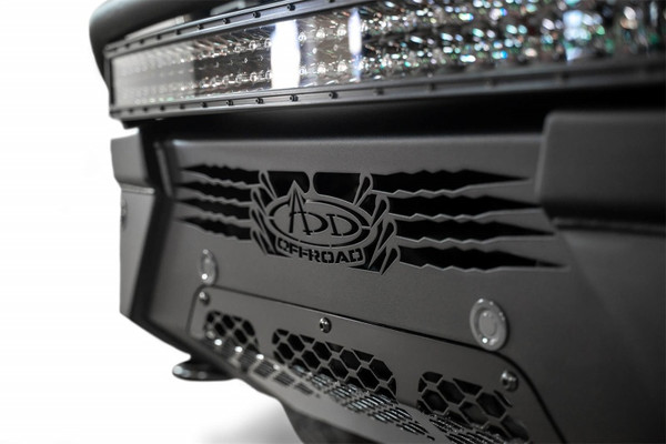 The newly redesigned Addictive Desert Designs HoneyBadger Front Bumper keeps the same rugged styling as the original but with a low-profile fitment. There is an optional top hoop, but either configuration has room to mount a radius 30 in. light bar on top of the bumper. The center of the bumper houses a straight 20 in. light bar, and two cube lights can be mounted behind the side panels. The HoneyBadger comes in hammer black powder coat with satin black panels. OEM amenities, such as parking sensors and tow hooks, are retained. Even though it is an aftermarket front bumper, the HoneyBadger follows the bodylines perfectly, making the front of your Ford F-150 look unique without sacrificing quality. As always this product is fully bolt-on and made in America.