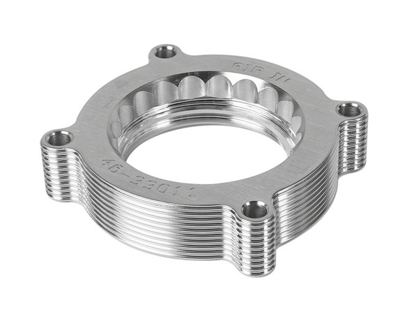 Silver Bullet throttle body spacers create turbulence in the air flow at the point just prior entry into the engine increasing horsepower, torque and improving throttle response and fuel efficiency. Silver Bullet throttle body spacers are constructed out of durable T-6061 billet aluminum and using a unique serrated/helix entry to create turbulence at the manifold while eliminating the annoying whistle found in other helix only throttle spacers.