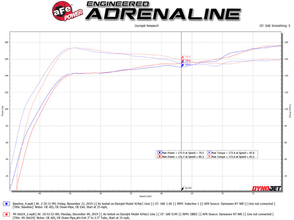 Performance Gains: This system produced gains of up to +6 HP and +5 lbs. x Ft. TQ., as measured on our in-house dyno.3" - 2-1/2" 304 Stainless Steel Construction: This cat-back exhaust system is constructed of 3" - 2-1/2" mandrel-bent, brushed finished 304 stainless steel tubing for maximum strength and durability.High-Flow 304 Stainless Steel Polished Mufflers: This system features high-flow 304 stainless steel polished mufflers, producing a smooth sound. The mufflers has a polished finish for ultimate corrosion resistance.Dual 4-1/2" Diameter Carbon Fiber Exhaust Tips: Finishing off this exhaust system are dual 4-1/2" diameter carbon fiber 304 stainless steel clamp-on exhaust tips. The tips features an aFe POWER logo for a unique style.Installation: Utilizing a factory style flange and hangers this system is a direct bolt-on system, which requires no cutting or modifications for a hassle-free installation.Integrated Mitered Merge Collector: A mitered merge collector is used to decrease turbulence and increase exhaust velocity resulting in increased horsepower, torque and improved throttle response.Computer-Aided Design: Utilizing state-of-the-art computer-aided design technology, this exhaust system is designed for custom, high tolerance factory fitment.TIG-Welded: 100% TIG-Welded for race-proven strength and durability.Emissions Disclaimer: This product does not require a CARB EO#.aFe POWER exhaust systems are engineered and manufactured in our Corona, California facility.