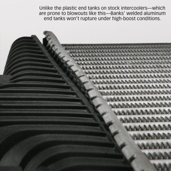 Eliminates restrictions, dramatically increasing the cooling capacity for massive continuous power. Big aluminum end tanks won't burst like stock, with a thicker core for a 21% improvement in volume. Includes mandrel-bent 3.5 inch high-flow boost tubes and super-flow High-Ram intake manifold for maximum performance.Superior to Stock: Everything about Banks Techni-Cooler Intercooler System is designed bigger and better. This upgrade kit includes a set of 3.5 inch high-flow boost tubes and a Banks designed intercooler solution.The Banks Boost Tubes feature over sized mandrel-bent pipes matched to the increased performance design of the new intercooler. The Banks designed intercooler has a 19 percent thicker core with 21 percent greater volume to improve cooling. It also has large high-efficiency all-aluminum end tanks and wide-open inlet / outlets for a 69 percent greater flow area. Lastly to complete the kit, our Banks High-Ram Intake Elbow is also included. The Banks Techni-Cooler dramatically increases the engines cooling capacity and power potential by balancing a richer fuel mixture with cooler, denser, improved airflow.Result: You get higher continuous power and more power at any exhaust gas temp (EGT), with better fuel economy, and lower EGTs. That's a truckload of benefits! It doesn't get any cooler than Techni-Cooler! Mounting hardware included.