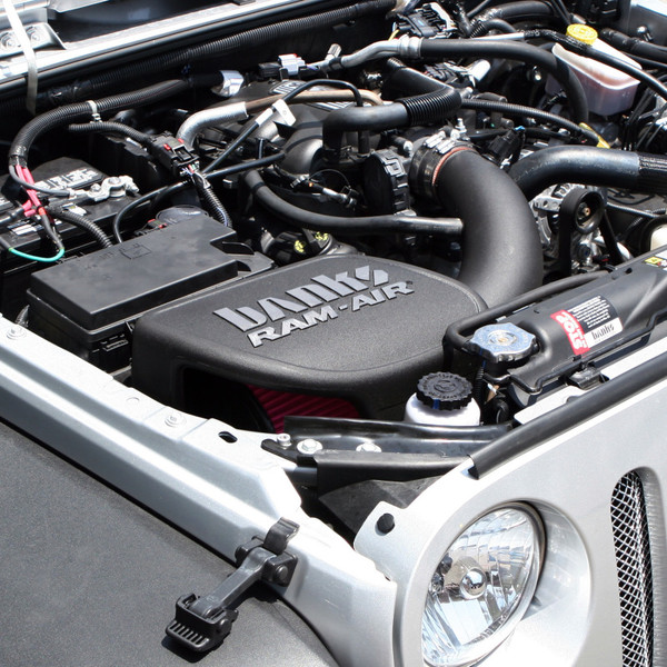 Outflows stock by 73%. Cold-air intake with large lifetime filter, enclosed housing and large tubing offers huge improvements over stock flow, increasing power and fuel economy.Banks Ram-Air Intake System replaces the factory's flat panel filter with a large conical filter that provides maximum high-flow filtration. The Ram-Air's opening dwarfs the stock's inlet, and without the 90-degree detours that choke airflow and kill power. The huge inlet, enclosed housing, and much larger tubing reduce restrictions, dramatically improving airflow to the cylinders.The results are impressive: Banks Ram-Air outflows the stock intake by 73%, improving the Jeep's power and fuel economy. And Banks Ram-Air is designed to accommodate engine movement, which prevents component damage for reliable service life. US Patent #10,138,851 B2