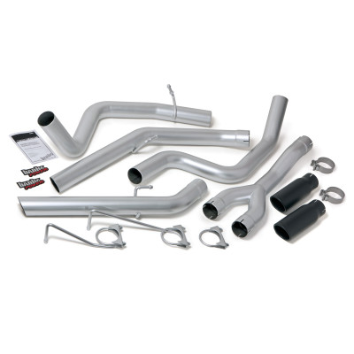 5 inch aluminized steel constant-diameter DPF-back exhaust system with patented negative-backpressure SideKick tip. Improves throttle response and fuel economy by lowering backpressure up to 9 percent at the turbine inlet. Allows the engine to breathe more efficiently. Includes huge black Cerakote obround SideKick tip. The new 5 inch Monster Exhaust designed specifically for the 2019-2024 Ram 2500/3500 6.7L. The DPF-back exhaust system features constant-diameter 5 inch mandrel-bent aluminized steel tubing and a massive patented tip which virtually eliminates backpressure after the DPF. Cummins owners can choose from two huge patented 6.5 inch x 7.5 inch ob-round slash-cut exhaust tips chrome-plated polished stainless steel or high-temp Cerakote matte black with a rolled edge.