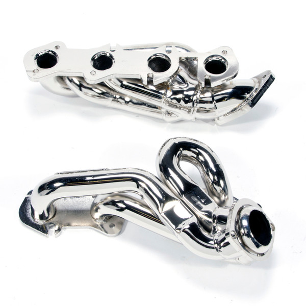 These BBK Performance 1-5/8 shorty tuned Length exhaust Headers are designed and constructed as direct fit replacements for all 96-04 Mustang GT applications. Each header is manufactured with 1-5/8 in. CNC mandrel bent tubing that offers unrestricted exhaust flow for increased horsepower and torque over factory OEM manifolds. BBK tuned Length headers offer improved scavenging waves for better combustion, which leads to improved performance and fuel economy over stock or equal Length headers. As with all BBK Performance exhaust headers they feature a 3/8 in. laser cut flange for additional strength and a guaranteed leak free fit. All headers are robotically and precision hand welded and then pressure tested to ensure years of reliability and performance in the real world. All BBK exhaust headers are available in a titanium ceramic or polished silver ceramic coated finish and include new exhaust header gaskets, header bolts and hardware to complete the installation.