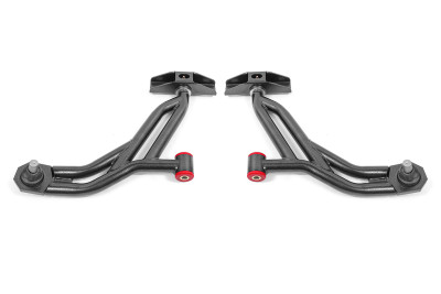 A-arms are one of the most important, yet overlooked suspension components. They are the direct link between the front wheels and the chassis. Any deflection causes a change in alignment, which results in poor performance and driving feel. Fabricated from heavy-duty 1.25-inch, 0.120-inch wall DOM tubing, deflection is eliminated with A-arms from BMR Suspension. BMRs AA754 Lower A-arms are equipped with greasable heavy-duty ball joints, 95-durometer polyurethane bushings (front mount), and greasable Delrin bushings (rear mount) to handle the high loads. Polyurethane bushings add a solid, more responsive feel over the stock rubber bushings. BMRs bushings are internally fluted, which allows grease to evenly coat the inner sleeve. These flutes also direct grease to the outer edge of the bushing, keeping the thrust surface lubricated. This efficient lubrication ensures quiet, reliable operation over the life of the bushings. The combination of poly and Delrin bushings gives you improved steering feel and responsiveness for any type of driving. BMRs AA754 lower A-arms eliminate A-arm deflection, greatly improving steering feel and response in normal and performance driving situations. The polyurethane and Delrin bushings add strength and reduce deflection over the stock rubber bushing, while still absorbing much of the NVH. The means you get a great blend of performance and comfort. Designed for street performance, drag race, and handling, and pro-touring applications, BMR lower A-arms are engineered to give you improved geometry and increased lateral grip during cornering situations. BMR Suspension AA754 Non-Adjustable Lower A-arms are available in black hammertone and red powdercoat for long-lasting good looks. Installation time is 3-4 hours. Proudly made in the U.S.A. Control arm hardware kit RH014 (Includes upper and lower control arm hardware - Highly Recommended) also available.