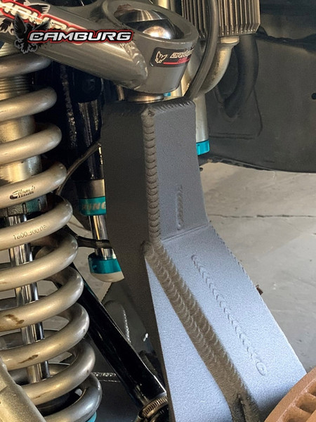Introducing our Camburg performance spindles, the strongest stock replacement spindles/knuckles on the market. Designed to work with our long-travel kit and stock length lower arms, these spindles offer enhanced strength and craftsmanship. We have leveraged our 13+ years of experience with the stock design and custom versions for the military to create a superior product. Our spindles feature improved geometry and increased durability, along with a relocated ABS speed sensor for off-road protection. Compatible with both 4WD and RWD models, these spindles require no modifications and maintain the factory specifications in terms of lift and width. Using advanced Faro scanning technology and SolidWorks CAD/CAM modeling, we manufacture these spindles in-house for precise control. Starting with steel billets, we heavily CNC machine them for weight reduction and precision, followed by MIG welding of laser-cut plates. The spindles are then sandblasted and powder coated textured black for a durable finish. They come ready to install with all necessary hardware, including stronger stainless braided Kevlar reinforced front brake lines. For 2016+ models, drilling out the brake caliper bolt holes to 9/16" is required due to larger metric bolts. We recommend replacing the inner hub seal on older or higher mileage 4WD vehicles. Please note that these spindles are designed as OEM replacements and are not compatible with drop-down bracket lift kits.