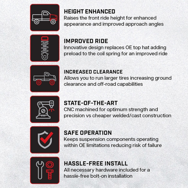 Camburg's Dominator Preload System is a game-changer in the leveling suspension market. It replaces the top hat of OE shocks with a one-piece billet aluminum design that not only preloads the coil spring but also provides added lift. This innovative system ensures that suspension, steering, and driveline components operate within OE working limitations, preventing wear and failures. The added lift and preload allow for larger tires, increasing ground clearance and improving approach angles. It also offers better bottoming control and minimizes front end dive and body roll while maintaining a plush ride. CNC machined from aerospace 6061-T6 billet aluminum, red anodized, and laser-etched, the Dominator Preload System is a high-quality product. It includes all necessary hardware for a hassle-free installation and is suitable for both seasoned off-road enthusiasts and weekend warriors. Upgrade your stock vehicle for your next off-road adventure with Camburg's Dominator Preload System.