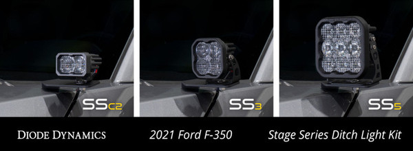 FeaturesBolt-on fitment compatible with Ford Super Duty 2017-2022.Allows you to mount two Stage Series LED Pods above the hood.Utilizes existing mounting points for easy installation.Thick-gauge stainless steel construction.Low-profile design.Assembled in USA.OverviewPerfect fitment. The Stage Series Backlit Ditch Light Kit compatible with the Ford Super Duty 2017+ allows you to easily mount two SS3 SSC2 or SS5 Backlit Pods above the hood. These application-specific brackets were CAD-designed to install using factory mounting points. No cutting or drilling required! This kit features a low profile design while minimizing glare and will not interfere with raising or lowering the hood.Backlight Functionality. Both the SS3 SSC2 or SS5 pods included in our Stage Series Ditch Light Kits feature a brilliant Amber backlight. This integrated backlight gives you an additional accent light along with the main beam. The backlight fully illuminates the TIR optic providing a more unique and modern look than the small indicator LEDs found in other products. To power the backlight use the included harness to tap your desired vehicle function.Built to last. The brackets in this kit are constructed out of thick-gauge stainless steel. Unlike other options made out of mild steel these brackets are full stainless steel and won't corrode over time. With their thick-gauge construction you also won't experience any vibration or bouncing while driving.Focused. Optics like reflectors or simple lenses lose light internally and to glare. However the custom-engineered TIR optic in the SS3 and SSC2 collects all of the light from the LED and directs it only where you need it drastically reducing glare and improving total efficiency.