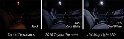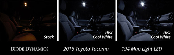 194 HP3 LED Features Diffused lens design for even spread Proven performance highly reliable Increased output with LED Appearance Plug and play simple installation Overview Design. The 194 HP3 LED bulb is a compact simple LED replacement with proven performance. The single diffused optic spreads light in the original lamp for OEM-style appearance and function. With its dual-lead contacts it will fit snugly in the socket and its light weight means it won't vibrate loose over time. Reliability. Unlike other bulbs on the market this bulb is built with constant-current circuitry along with transient suppression. That means this bulb will last for years not months with no flickering or failure. And like every Diode Dynamics product it's backed by an industry-leading three-year replacement warranty. Brightness. With 56 lumens of true measured output the HP3 LED will provide about double the total light compared to your original 5W 194 or 168 sized bulb. Its even spread in the housing makes for a good amount of useful light whether mounted in a straight or side-plug orientation. Colors. In addition to vibrant colors of blue red amber and green the 194 HP3 is available in a number of white color options. These include a cool white 6000K warm white 3000K a 5000K or pure white and a 4000K or natural white. Whether you want a modern cool white appearance or a traditional warm white color with more output we have the color to fit your need!