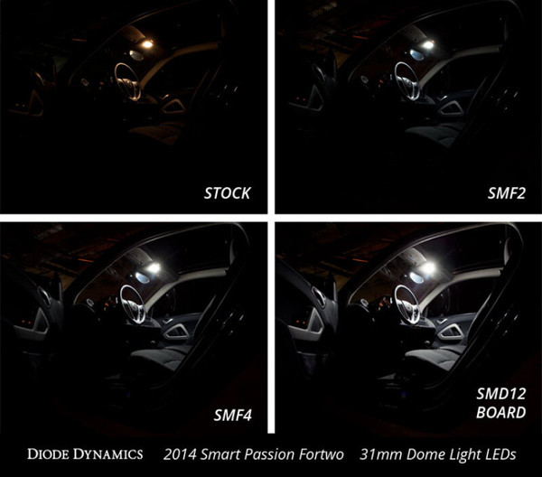 Features Direct replacement for factory 36mm festoon bulb Adds more modern LED appearance Plug and play simple installation Overview Design. The 36mm SMF2 LED bulb is a direct replacement for any 36mm-size bulb commonly found in vanity mirror lights in many vehicles. Populated with two 5050-size SMDs the SMF2 upgrades the factory yellowish incandescent bulb to a more modern LED appearance while adding far more total light output than the factory bulb. The SMF2 was designed with an embedded load resistor and implanted diode for superior reliability. With its durable metal terminals it will fit snugly in the socket and its light weight means it won't vibrate loose over time. Reliability. Unlike other bulbs on the market this bulb is built with constant-current circuitry along with transient suppression. That means this bulb will last for years not months with no flickering or failure. And like every Diode Dynamics product it's backed by an industry-leading three-year replacement warranty. Brightness. With 24 lumens of true measured output the SMF2 LED will provide about double the total light compared to your original 36mm-sized bulb. All Diode Dynamics LED lighting is rated with accurate measured lumen figures not calculations or guesses. We test the true output in-house and provide you the real numbers to compare. Colors. In addition to vibrant colors of blue red amber and green the SMF2 is available in a cool white 6000K and warm white 3000K option as well. Whether you want a modern cool white appearance or a traditional warm white color we have the color to fit your need!
