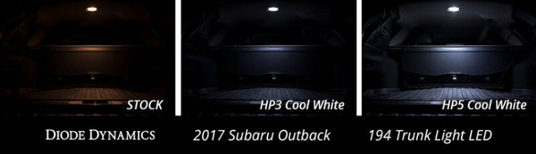 FeaturesCompatible with Subaru Outback trunk light bulbs.Modern cool white appearance or choose your color.Plug and play no modification with factory 194 bulb size.Available in multiple brightness levels.OverviewModern Style. Replacement LED bulbs are a great way to improve the look and function of your trunk light. Compared to the original incandescent bulbs they will provide a modern premium appearance and more light output when loading and unloading your vehicle. The installation is straightforward with just a bulb swap - making this a great simple upgrade for your vehicle.Brightness. All Diode Dynamics LED lighting is rated with accurate measured lumen figures not calculations or guesses. We test the true output in-house and provide you the real numbers to compare.Color Options. In addition to vibrant colors of blue red amber and green our trunk light bulbs are available in a number of white color options. These include a cool white 6000K warm white 3000K a 5000K or pure white and a 4000K or natural white. Whether you want a modern cool white appearance or a traditional warm white color with more output we have the color to fit your need!Colors that match. Most of us have seen lighting setups with random shades of white that don't quite match. At Diode Dynamics we operate an integrating sphere which is a piece of lab equipment used to analyze the exact color spectrum of the LED bulbs we produce. By testing each batch of products we can ensure that all bulbs will match in color to avoid various tints of white. These bulbs will match any other upgrades you may have from Diode Dynamics for factory-style uniformity and a clean appearance.