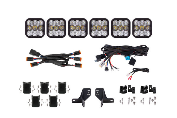 FeaturesBolt-on fitment compatible with Ford Bronco 2021Ultra-high intensity with custom-engineered TIR opticsSelectable backlight color with eight color optionsTorture-tested heavy-duty constructionControl through factory aux switch bank using the included harnessAssembled in USAOverviewPerfect Fitment. The Grille CrossLink Lightbar Kit compatible with Ford Bronco 2021 from Diode Dynamics allows you to mount six linked SS5 LED pods on the factory grille. These application-specific brackets were CAD-designed to bolt into place using factory mounting points on the grille. No cutting or drilling required!Designed for Performance. Featuring the highest output intensity of any 5-inch LED pod on the market these lamps have been designed for maximum functionality with patented technology and custom-engineered TIR optics all in a durable package.Selectable Backlight. The Stage Series 5inch LED Pods included in the White kit feature a selectable backlight with eight different color options perfect for an extra styling accent or for more visibility when you(TM) re not using the main beam. Selecting your backlight color is easy - simply alternate the power on and off. There(TM) s no complicated programming with a controller! The SS5's backlight fully illuminates the TIR optic providing unique accent lighting that you won't find on other LED pods. NOTE: Due to the yellow lens the Yellow kit is only available with an Amber backlight color.CrossLink. Our patent-pending CrossLink technology allows you to link up to eight SS5 pods together to create your own lightbar. The single-piece CNC aluminum link provides extreme rigidity but is fully adjustable for both straight and curved configurations.