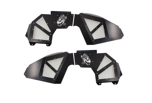 Fits 2018 to Current JL Wrangler, Rubicon and Unlimited 2 and 4-Door Models. Made from Black Powder Coated Aluminum. Fishbone logo laser cut on all 4 inners. Front Inner Fender JL Rear set will only...