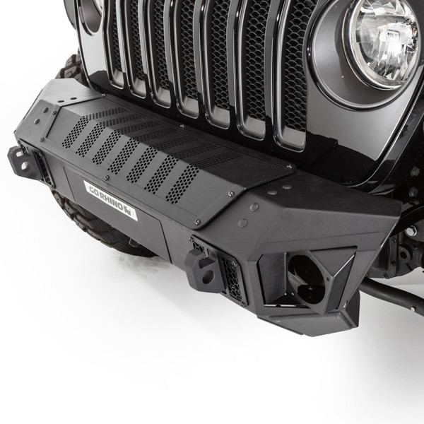 Part of Go Rhino's famous Jeep Bumper family of products. Trailline Winch Ready Front Bumper with stubby style end caps and patented(US D790,408) rhino hook shackles. Bumper has gear drawer with latch. 3 optional light bar mounts also available. Trailline Bumpers come with a Limited Lifetime warranty on materials and construction and a 5 year warranty on the Textured Black Finish.