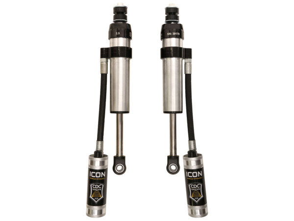 ICON Vehicle Specific (V.S.) 2.5 Aluminum Series shocks are designed and built to give your vehicle outstanding performance off-road and a smooth ride on the street. These shocks are configured specifically for each application in both length and damping tune. Like all ICON'S Shock Absorbers, V.S. 2.5 Aluminum Series shocks are 100% rebuildable and 100% revalveable. For piggyback and specific remote reservoir applications, ICON'S unique use of a 6061 billet aluminum manifold a few inches below the top cap of the shock creates an internal Bump Zone that when used creates an additional 20% of damping force. This additional force helps prevent harsh bottom outs and controls the suspension when compressing at high velocity. The ICON CDC Valve is an externally adjustable valve that restricts oil flow into the reservoir which creates 10 levels of compression damping force ranges.