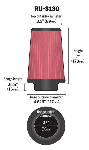 K&N Filter Universal Rubber Filter 3 1/2 inch Flange 4 5/8 inch Base 3 1/2 inch Top 7 inch Height - RU-3130