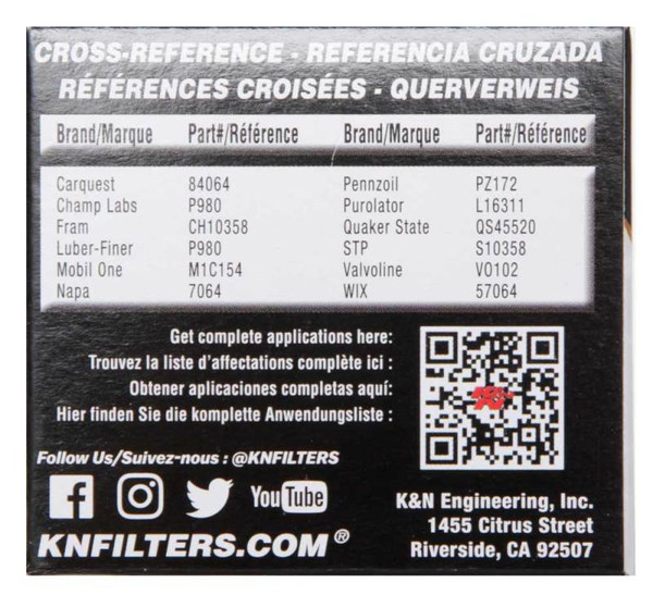 K&N Cartridge Oil Filters are designed to satisfy the needs of racers and engine builders as well as the average vehicle owner who wants the best oil filter available. K&N cartridge oil filters trap harmful contaminants while the filter's construction allows for high oil flow rates. All K&N oil filters are manufactured to meet stringent engineering standards. They are covered by a limited warranty to be free from defects in materials and workmanship when installed and replaced using engine and equipment manufacturer's recommended service intervals.
