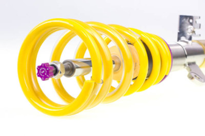 KW V2 INOX-LINE coilovers are the perfect solution for drivers who want more than just outstanding looks and adjustable ride height. In addition to stainless steel coilover struts, and corrosion-resistant components built for long term durability, KW V2 coilovers utilize TVR-A (Twin Valve Rebound - Adjustable) technology that allow Adjustment of the rebound damping characteristics with 16 clicks so you can fine tune the ride comfort or performance to your satisfaction. As with all KW coilovers our engineers develop vehicle specific damper settings that undergo comprehensive testing on the Nurburgring Nordschleife and in our KW 7-post Driving Dynamic Test Center. With a KW coilover kit the driving experience is more dynamic and direct. With the rebound adjustability you have a more direct influence on the handling or comfort of the car. With 16 precise clicks you can adjust the KW dampers (more firm or more comfortable) without affecting the compression damping fine-tuned by our engineers. The two-stage, patented TVR-A (Twin Valve Rebound - Adjustable) technology enables a small volume of oil flow through an adjustable, conically shaped, low-speed bypass during low damper speeds, while at high damper speeds, the main rebound stage valve opens allowing a larger volume of oil to flow. This provides a big improvement in terms of ride comfort without influencing the high-speed range. There are 16 precise clicks available for individual settings, so you can choose between more comfort or more body control. With KW V2 coilovers you can achieve maximum lowering within an approved lowering range that ensures a proper functioning suspension and adequate travel after your car is lowered. Even after years of use you can easily adjust the ride height thanks to the dirt resistant trapezoid thread and composite adjustment collar.