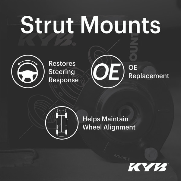 KYB Strut Mounts eliminate the vibration and noise caused by old, hardened vibration insulators. They optimize suspension performance by offering OE quality replacement components designed for each application. KYB Strut Mounts cushion the impacts from road bumps to reduce the jarring effect, noise and vibration that old mounts transmit into the vehicle. Front bearing plates are the steering pivots and support vehicle weight. They are critical to steering performance and wheel alignment. KYB Strut Mounts and bearing plates have a reputation for providing the highest quality in the industry.