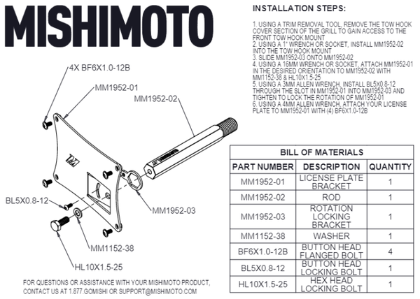 The all-new 2023+ Nissan Z is a sleek showstopper. What’s not-so sleek? Its front license plate location. Sitting directly in the center of the grille, the front plate obstructs air flow to the radiator while also creating wind resistance. Luckily, there’s no need to worry about drilling holes in your new bumper because Mishimoto has a solution: the 2023+ Nissan Z Mishimoto license plate relocation kit!----Designed specifically for the 2023+ Nissan Z, our license plate relocation kit is constructed from high-strength, anodized and powder coated 6061-aluminum. It mounts directly to the OEM tow hook location, allowing for a clean and seamless installation. Angling and relocating the plate to the side not only helps reduce wind resistance, but it also frees up grille space, facilitating critical airflow to your radiator and letting your Z breathe easy. And let’s be honest, it just looks better! The days of ugly holes in your bumper are no more. Our license plate relocation kit includes all necessary hardware for an easy installation, and as with all our products, this kit includes our signature Mishimoto Lifetime Warranty.