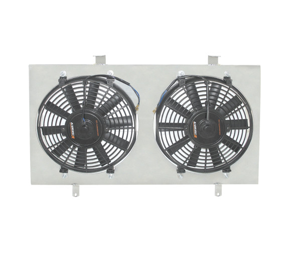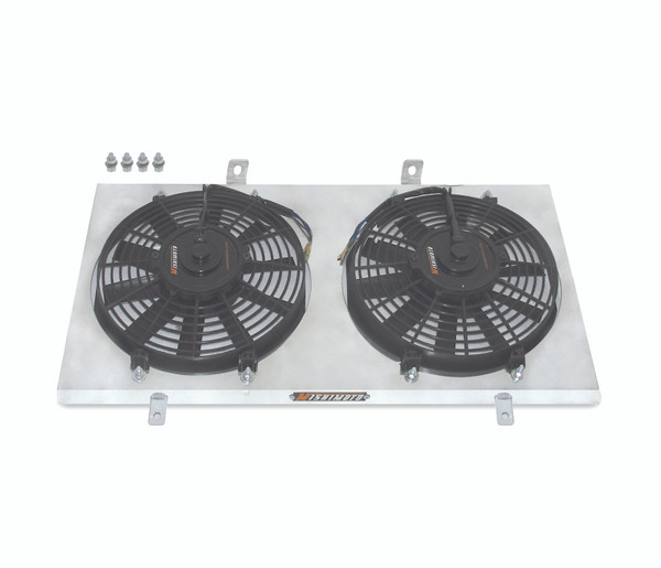 The Mishimoto Nissan 240SX S13 aluminum fan shroud kit is the perfect match for our radiators.Mishimoto fan shrouds are made for a direct OEM fit and include two 10-inch Mishimoto electric fans.All Mishimoto fan shrouds are significantly lighter and more durable than OEM fan shrouds and will notably improve engine cooling performance by delivering a significant amount of cooler air directly to the S13 radiator.Mishimoto fan shroud kits also safely secure the fan blades from any potential damage to other essential engine components.
