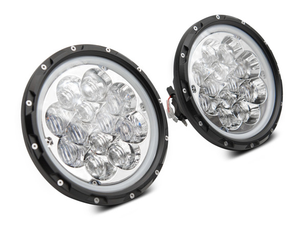 Improve the illumination from your Jeep Wrangler with Axial's Spider LED Headlights with Amber DRL and Angel Eye Halo. The Spider LED Highlights are bright and feature the unique arm design, while the Halo feature adds even more light around the bulbs. Your 1997-2018 Wrangler will get bright, wider light and a cool stylistic upgrade to boot. When you install these Axial Headlights with Amber DRL, you get quality light for a long time. The lifespan of these Cree LED lights is 50,000 hours, with a color temperature of 5600-6000K, and operating Lumens output of 4800LM (High Beam) and 2400LM (Low Beam). These Headlights' housings, are built from high-quality aluminum, which will support the lights through anything. The Headlights measure 7” in diameter. The chrome finish is durable and blends beautifully with your Wrangler. The Axial Spider LED Highlights employ a plug-and-play system. Installing the Halos requires some additional wiring. These aftermarket LED Headlights are intended for use with factory halogen headlight equipped models. In order to use these aftermarket LED Headlights on a Jeep that is already factory equipped with LED headlights, you will require a set of factory halogen headlight buckets – not included.