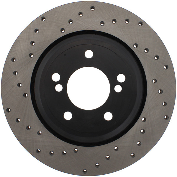 StopTech Drilled Sport Rotors are 1-piece direct replacement brake discs for factory brake systems and stock calipers that look great behind your wheels – and offer significantly improved braking performance. The unique cross-drilling aids with heat and brake dust dispersal; prevents glazing of the pads; adds bite and improves wet and dry braking performance. Built to last; the black e-coating provides protection from corrosion and the high carbon metallurgy (in most applications) offers quieter operation; better crack resistance and increased performance.
