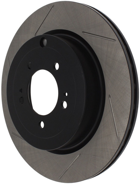 StopTech Slotted Sport Rotors are 1-piece direct replacement brake discs for factory brake systems and stock calipers that look great behind your wheels – and offer significantly improved braking performance. The unique slotting aids with heat and brake dust dispersal; prevents glazing of the pads; adds bite and improves wet and dry braking performance. Built to last; the black e-coating provides protection from corrosion and the high carbon metallurgy (in most applications) offers quieter operation; better crack resistance and increased performance.