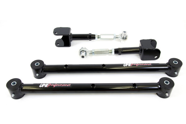 This kit includes (1) set of our tubular lower control arms and (1) set of our on-car adjustable upper control arms, "Ultimate Arms". Both items are direct replacements of the OEM set up adding strength, ride improvement and most importantly, rear end adjustment.