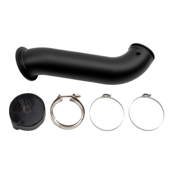 WCFab 4" Turbo Down Pipe for 2004.5-2007 5.9L Cummins with High Mount style turbo on 2nd Gen style exhaust manifold allows for a quick and simple down pipe install. No cutting of your exhaust system required! This down pipe connects to the v-band flange on the exhaust pipe just as your factory turbo/cast elbow did. The upper flange measures 4" diameter to mate with S300 exhaust housing. The lower flange connects to the factory exhaust system v-band flange using the OEM v-band clamp. This down pipe is high-temperature ceramic coated and includes heat wrap with clamps and a 3.5" V-band Clamp for turbo connection.