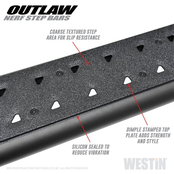 Westins Outlaw Nerf Step Bars offer the perfect balance between function and strength resulting in the ultimate rugged look designed to last and impress. Engineered to fit tightly against rocker panels, the Outlaw Nerf Step Bars provide a solid fit and superb protection while simultaneously improving vehicle cab access. Whether you are an avid overlander or simply an off-roader, rest assured you will be safely stepping into your vehicle with a 16 gauge steel coarse step surface and 2in. diameter tubing. Featuring bolt-on installation, an e-coated base coat and textured black powder coat top finish, Westins Outlaw Nerf Step Bars are the ideal match for the toughest of conditions.