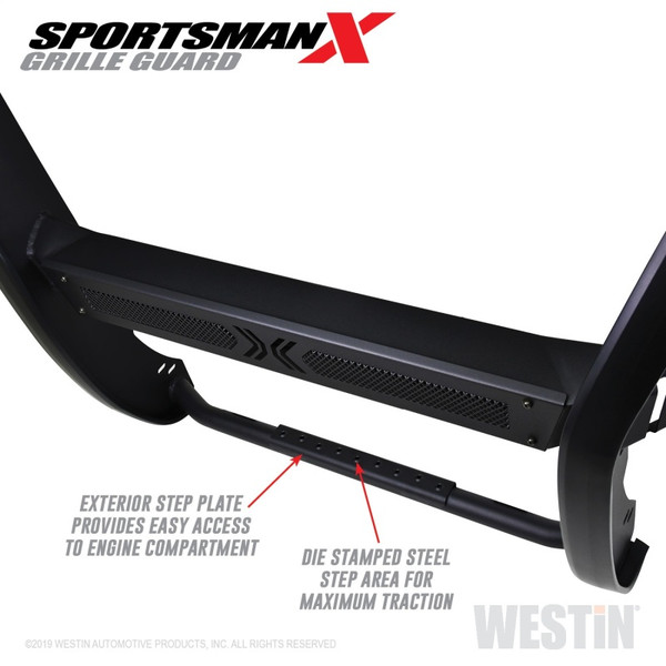 Westins Sportsman X Grille Guard effectively combines aggressive styling with heavy duty front end protection. Engineered to provide both great looks and performance, Sportsman Xs unique design compliments todays larger grille designs, and is available to fit most full and mid size truck applications. Sportsman X has an optional detachable mesh panel (sold separately) which is specifically designed to fit the opening in the center section of Sportsman X Grille Guard, or can be removed to accommodate the flush mounted 26in. dual row LED light bar (sold separately). A smaller removable mesh panel designed for the factory sensor location opening is included as standard with Sportsman X. For specific Chevy and Dodge/RAM applications a Sportsman X Sensor Kit (sold separately) is available. An exterior step plate is located on the 1-5/8in. bottom tube to provide easy access to the engine compartment. Built with heavy duty 2-1/4in. upright rubber strips and 1- 5/8in. outer tubes, Sportsman X Grille Guard is designed to provide protection and style for years to come.