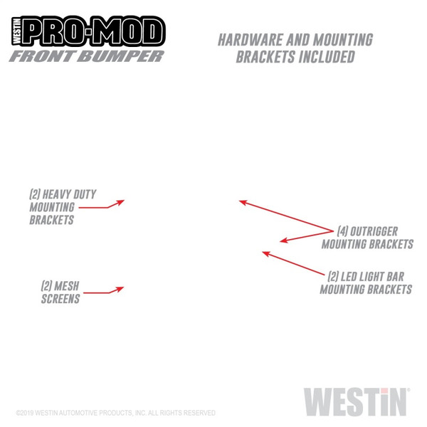 Westins Pro-Mod Front Bumper combines enhanced vehicle protection, with great looks. Pro-Mods revolutionary lightweight modular design is uniquely engineered with outrigger reinforcement brackets to provide maximum front end protection without compromising on strength, integrity or durability. The "high and tight" bumper profile creates a greater approach angle, which significantly improves off-road driving capabilities. The lightweight design also requires smaller shipping packages which dramatically reduces shipping costs. Pro-Mod bumpers feature a textured black finish with an e-coated base coat, providing long lasting corrosion protection from the elements. Once you see the Pro-Mod Front Bumper, the choice becomes obvious.
