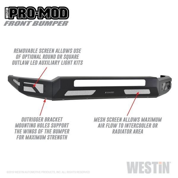 Westins Pro-Mod Front Bumper combines enhanced vehicle protection, with great looks. Pro-Mods revolutionary lightweight modular design is uniquely engineered with outrigger reinforcement brackets to provide maximum front end protection without compromising on strength, integrity or durability. The "high and tight" bumper profile creates a greater approach angle, which significantly improves off-road driving capabilities. The lightweight design also requires smaller shipping packages which dramatically reduces shipping costs. Pro-Mod bumpers feature a textured black finish with an e-coated base coat, providing long lasting corrosion protection from the elements. Once you see the Pro-Mod Front Bumper, the choice becomes obvious.