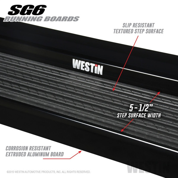 Westin's SG6 Running Boards feature textured slip resistant step pads enhancing footing in virtually all weather conditions. SG6 Running Boards also include a rocker panel gap strip to provide users with the appropriate Westin finished look. A polished aluminum finish with a protective anodized coating prevents oxidation increasing durability and extending product life. A vehicle specific mount kit is required and sold separately. Choose Westin's SG6 Running Boards for the perfect balance between safety, function and style!