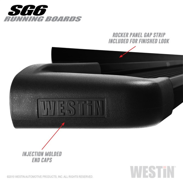 Westin's SG6 Running Boards feature textured slip resistant step pads enhancing footing in virtually all weather conditions. SG6 Running Boards also include a rocker panel gap strip to provide users with the appropriate Westin finished look. A polished aluminum finish with a protective anodized coating prevents oxidation increasing durability and extending product life. A vehicle specific mount kit is required and sold separately. Choose Westin's SG6 Running Boards for the perfect balance between safety, function and style!