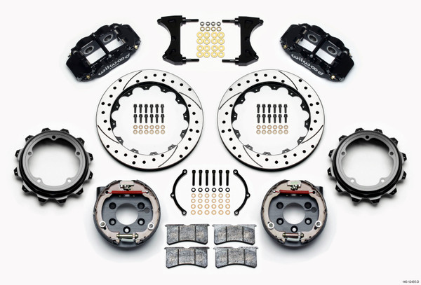 Forged Narrow Superlite 4R rear disc kits provide the ultimate Big Brake solution for popular muscle car rear axles that require a parking brake. FNSL4R four piston calipers, 13” or 14” two-piece rotors, and high performance BP-10 compound pads provide optimized and balanced braking to compliment front big brake upgrades on all types of custom, show and high performance street machines. The neatly hidden internal shoe system provides a clean installation with superior static holding power for parking. Optional caliper finishes and rotor designs allow builders to personalize the style and performance for every application.